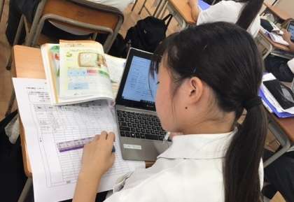 1年生の家庭科は、中学生の1日の栄養をふまえて、夕食の献立づくりに挑戦しています。
