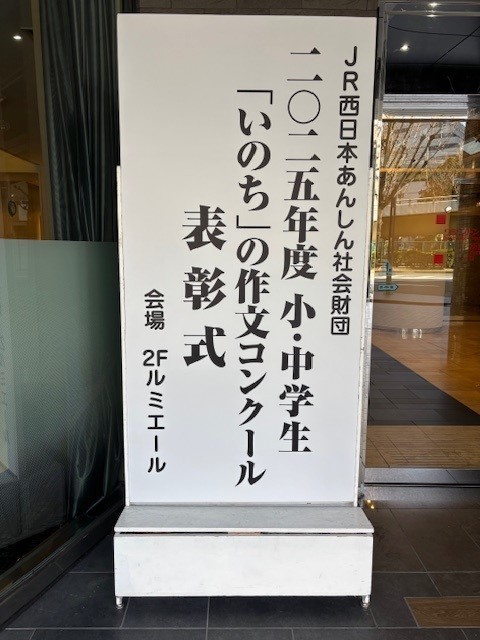 昨日、1月25日(日)に新大阪ワシントンホテルにて「JR西日本あんしん社会財団主催の「小・中学生『いのち』の作文コンクール」表彰式が開催されました。