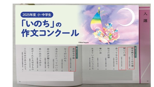 大切な人やペット、日々の何気ない会話を通じて感じたいのちに関する作品が多いことに加え、戦後80年となることから戦争や紛争を通じていのちについて考える作品もあり、小・中学生の皆さんが感じる様々ないのちに出会うことができました。