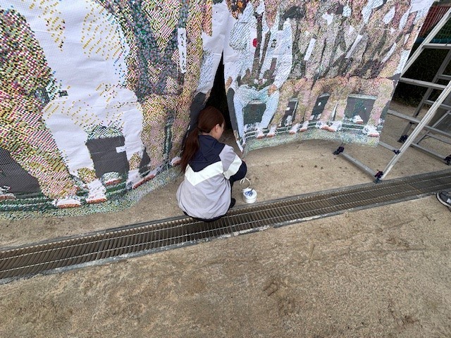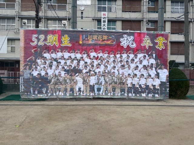 卒業式当日の朝早くから先生方が、在校生が3年生のために製作してくれたモザイクをグラウンドに飾ってくれました。