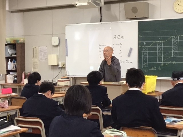 3組の理科の授業では、実際に石灰石から火花を散らし、その解説をお聞きしました。子どもたちも「なるほど~」と興味・関心の気持ちをひきだしていました。