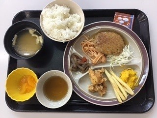 今日のメインおかずは、みんなが大好きなハンバーグと鶏の唐揚げです!