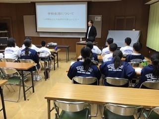 夕食を終えた後の時間は、研修室や体育館にて「ガイダンス」が行われました。 スライドを見ながら、これからの「学校生活」や「授業の受け方」について、先生方の話を真剣な表情で聞く姿が印象的でした。
