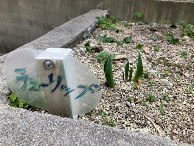 体育館横の花壇では、チューリップの芽が顔を出し始めました。とっても愛らしいで...