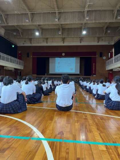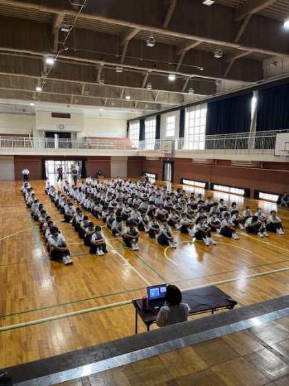 6時間目に体育館で、薬物乱用防止について、学校薬剤師さんより、危険薬物やエナジードリンク、オーバードーズについて講話していただきました。