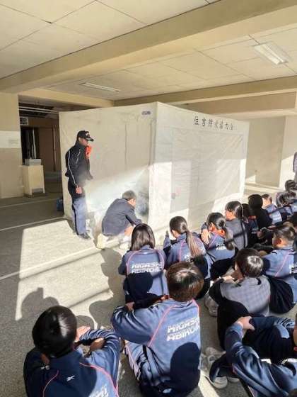 1年防災学習計画 公開日 2024/12/16 更新日 2024/12/16 お知らせ 12月12日(木)5.6限目に防災意識の高揚と放火防止啓発等を目的として、住吉消防署にご協力いただき、水消火器や煙テント、起震車での体験。AEDの学習を行いました。 いいね(0)