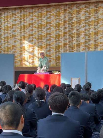 1年生は6限目に体育館で上方落語にふれあう会で桂文昇さんにお越しいただき、生徒や1年の教員もレクチャーを受けながら、小話を披露して、桂文昇さんの落語を鑑賞しました。