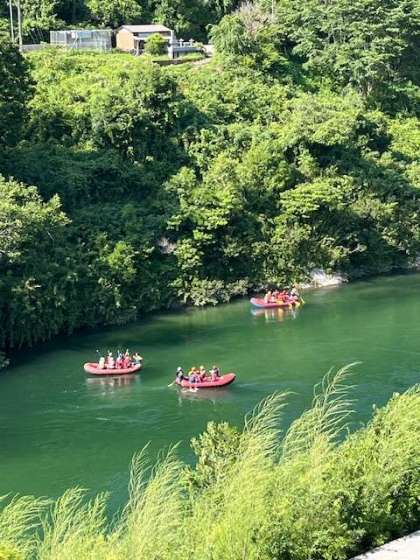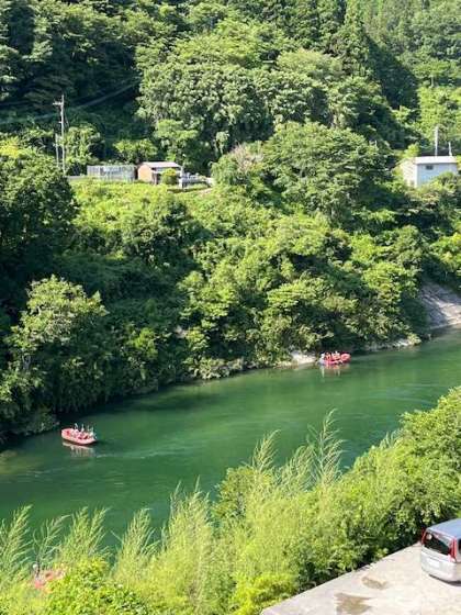 日差しが降り注ぐ中、冷たい川の水に触れて、気持ちよさそうに、川下りをしています。