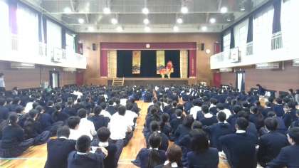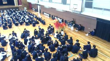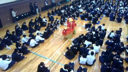 5・6時間目に体育館で芸術鑑賞として、今年度は中国雑技の獅子舞や変面を楽しんでいます。