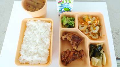 「本日の中学校デリバリー給食」です。鳥の唐揚げが入っています。
