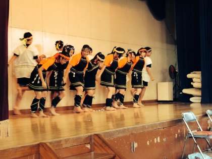 吹奏楽部が演奏する国歌で始まり、校長、台湾領事さんのあいさつ、生徒代表あいさつ、自己紹介と続き、そして台湾の皆さんが民族舞踊を披露してくれました。