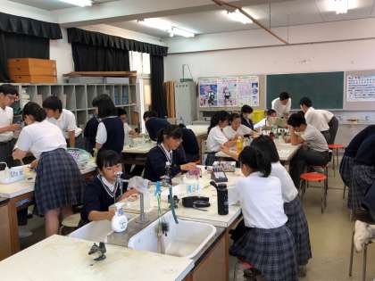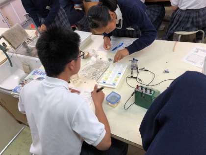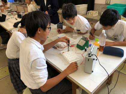 今週の3年生の理科の授業では、さまざまな水溶液に、電流を流し、電流が流れるかどうか確かめることをしています。
