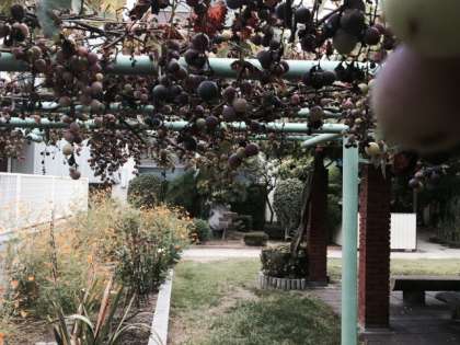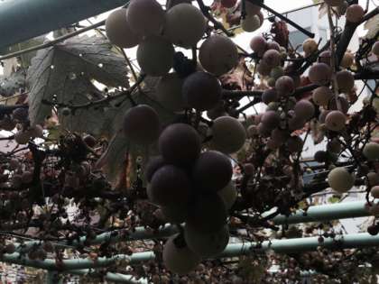 校舎、前庭の葡萄棚のブドウの実が、熟しています。