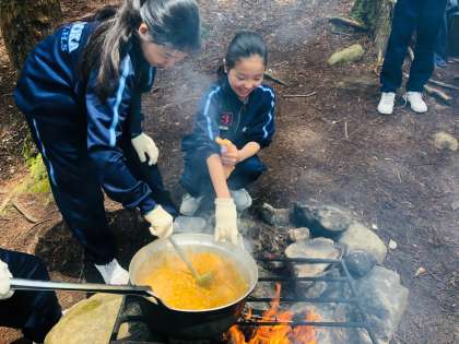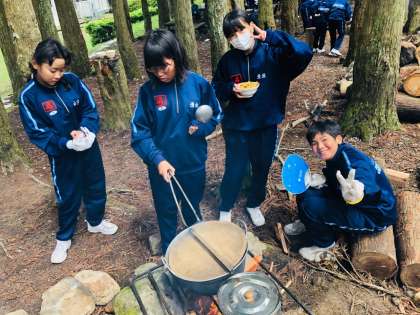 メニューは、定番メニューの「カレーライス」です。具材を洗ったり、切ったり、まきを割ったり、火をおこしたりと、役割分担をして協力して、作っていきます。