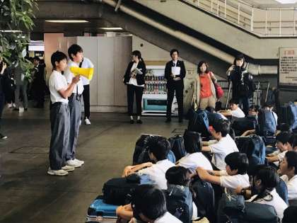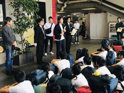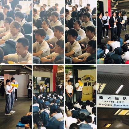 3年生は新大阪駅に、172名が集合。本日から3日間で、九州方面への修学旅行に出ます。これまでの学校生活や行事での取り組みで培われた行動力・判断力を生かし、みんながいい思い出となるものにしましょう。実行委員さんによって「出発式」が進行されています。添乗員さん方、写真屋さん、どうぞ、3日間よろしくお願いします。