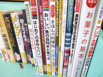 あとどんな本が読まれているかは、「返却された本の棚」を見ればわかります。写真は、ある日の本棚の写真ですが、意外と多いのが「料理」や「お菓子つくり」の本です。家でつくっている人が多いということでしょう。「料理」をするということは、「手順」を考えなければならないので、これは勉強にも役に立つと思われます。