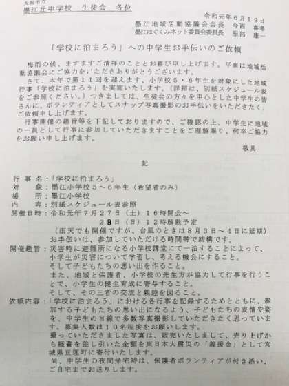 また、生徒会からは「学校へ泊まろう」の連絡がありました。