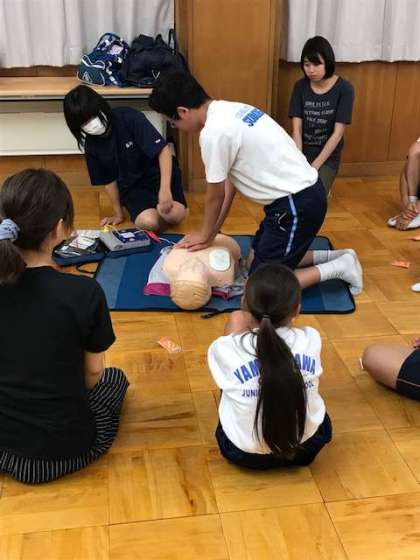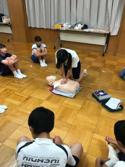 本日午後からの時間、大和川中学校に、住吉区の中学校の保健委員の生徒が集まり、「合同保健委員会」が開催されました。救急救命普及員のご講話を聞いたのち、救急救命・AED講習を行いました。