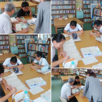 図書室を訪れると、生徒みなさんが、夏休みの宿題に取り組んでおり、質問してわからないところを、克服している姿がありました。がんばってください!!