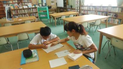 昨日に続いて、本日も図書室で、学校元気アップの「学習会」が開かれました。コーディネーターさんから、マンツーマンで夏休みの宿題について、教わっていました。