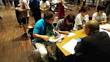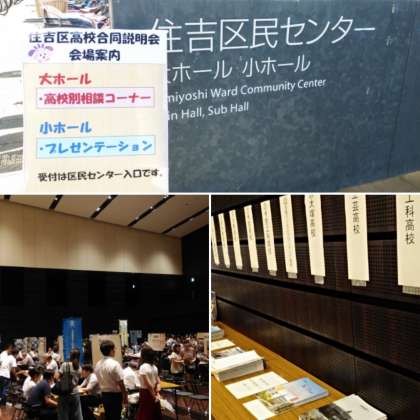 南ブロックの6区PTA共同開催の「高校合同説明会」が住吉区民センターで開催されています。会場に入ると、たくさんの生徒・保護者のみなさんが、高校のパンフレットたくさんもって、各ブースに分かれた高校の先生方と熱心にお話され、相談されていました。