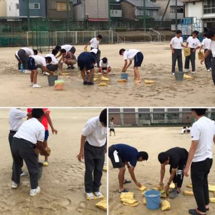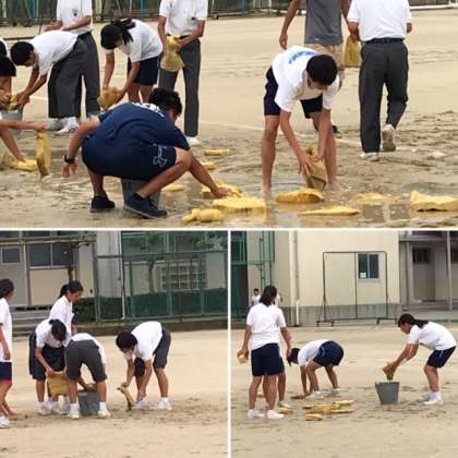 金曜日の全体練習の裏では昼休みに運動部の生徒、体育委員、先生方でグランドの復旧作業を行いました。