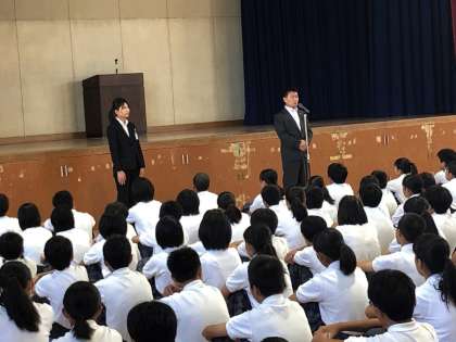 今日から11/1までの4週間、教育実習を行います。校長先生からご紹介いただき、教育実習の先生から「ヨロシクお願いします。」のあいさつがありました。