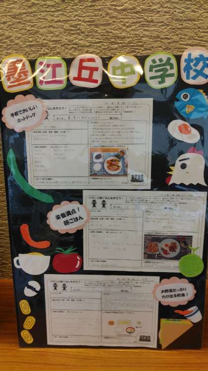 毎年「食育展」では、「中学生が考えて作った朝ごはんメニュー」が展示され、本校生徒のみなさんが考えて紹介した、朝ごはんも展示されています。