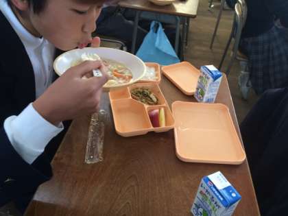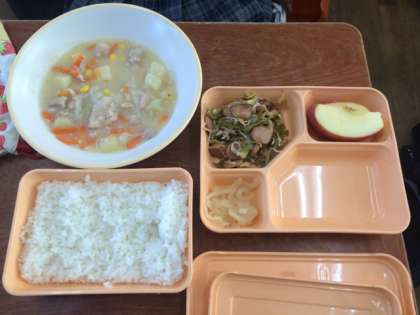 今日、28日の給食には、新メニュー「クリームシチュー」が登場しました。