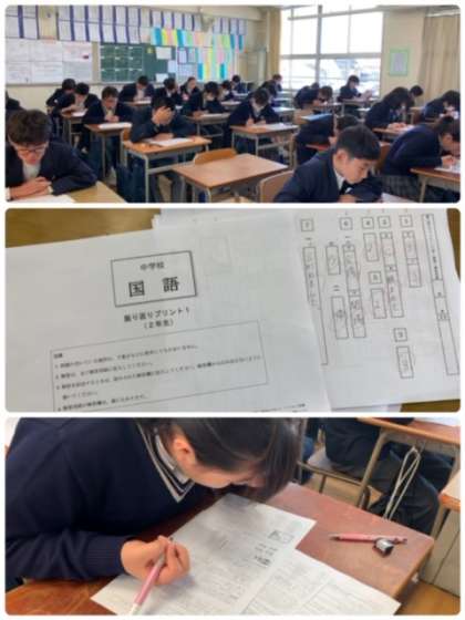 来年1月に実施予定の、「1,2年生チャレンジテスト」に向けて、1,2年生の5教科の授業では、教育委員会の専門グループが、生徒の学力向上のために作成した「振り返りプリント」に取り組んでいます。
