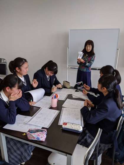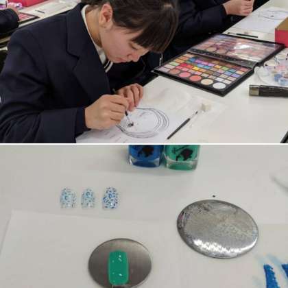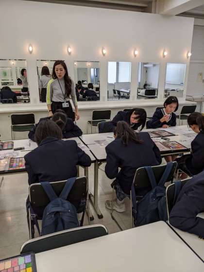 女子生徒のみなさんは、「メイクの授業」を体験しており、楽しく学んでいるようです。