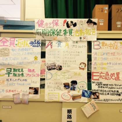 最後は、写真は、部活動、委員会で、茶道部、チャレンジ部、保健委員会の発表です。