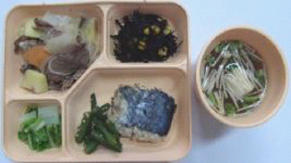 また副食は、三度豆のごまあえです。その他、肉じゃが、ひじきの炒め煮、白菜の柚子の香あえ、味噌汁ももつきました。