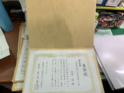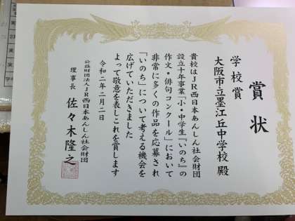JR西日本あんしん社会財団の事業である、「小・中学生『いのち』の作文・俳句コンクール」に応募したところ、3年生1名が優良賞を、学校全体で応募数が多かったことについて、表彰状を頂きました。