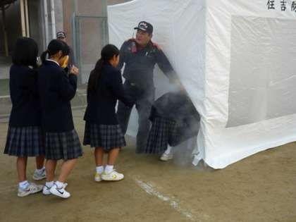 1度でも体験したことがあると、いざという時にきっと役に立つと思われます。幸い緊急出動で学習の予定が中断することもありませんでした。住吉消防署の皆さんご協力ありがとうございました。