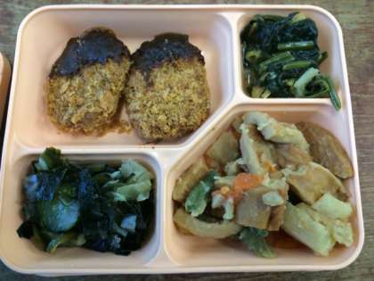 副食は、赤平天とじゃがいもの煮物、海藻サラダ、白菜とほうれん草のおひたしでした。