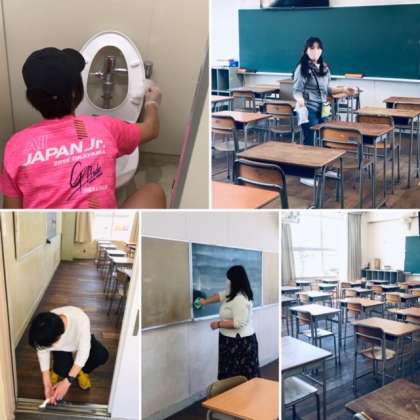 明日の分散登校に向けて、少しでも安心して登校できるように教職員全員で教室、廊下、手すり、トイレなど学校の清掃と消毒作業を行いました。