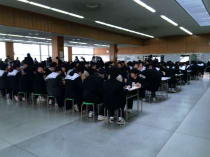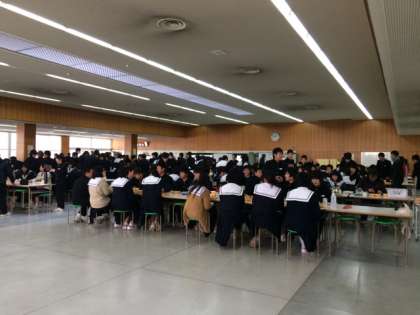 全員が一度に食べられるスペースがありますので、住吉中学では3年生まで全員が給食を食べることになっています。