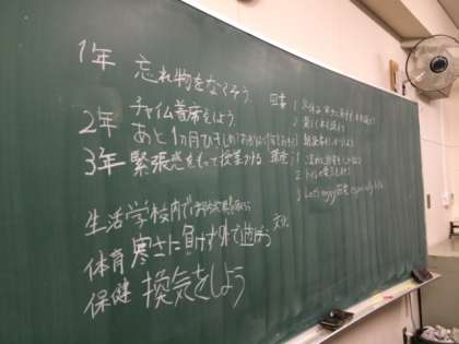 主な目標は、生活委員会「学校内では防寒具は取ろう」、保健委員会「教室内の換気に気をつけよう」、3年生「緊張感を持って授業を受ける」などです。