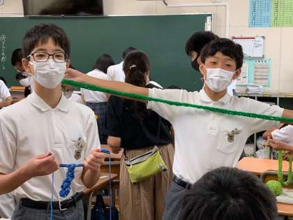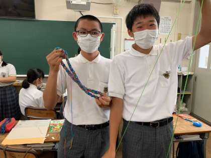 3年生の家庭科の授業では、「アクリルたわし」を制作しています。