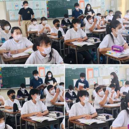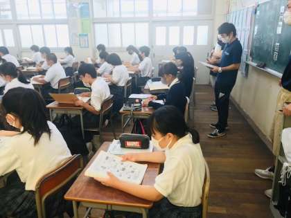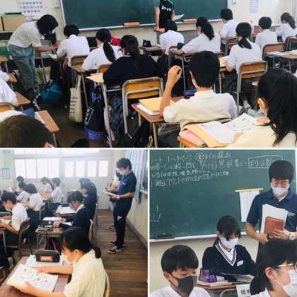 清水丘の旧6年生の担任の先生が、中学校1年生の授業の様子を見に来られました。