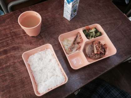 今日の給食「きのこソースハンバーグとマカロニスープ」