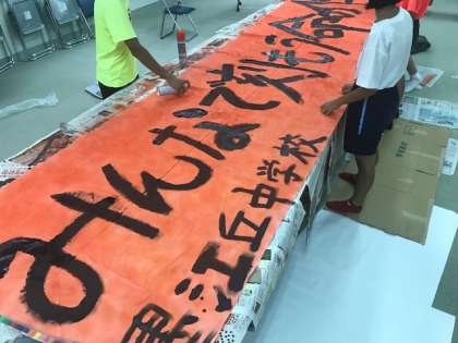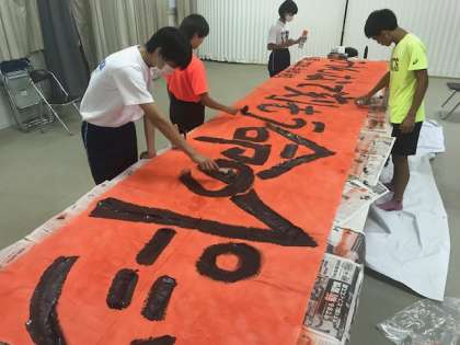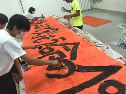2020年 前期生徒会メンバーで今年のテーマ「みんなで刻もう命のページ」の大横断幕を作成しています。