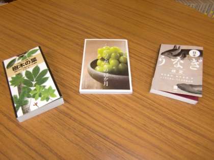 その中から3冊ご紹介します。写真の右から「日本うなぎ検定」(小学館)、「くらしのくだもの12か月」(朝日新聞出版)、「樹木の葉」(山と渓谷社)です。