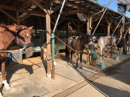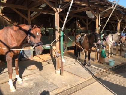 今から馬に乗ります。馬が暴れないように、手綱を引いて馬の気持ちを考え、心を1つに指示を出します。