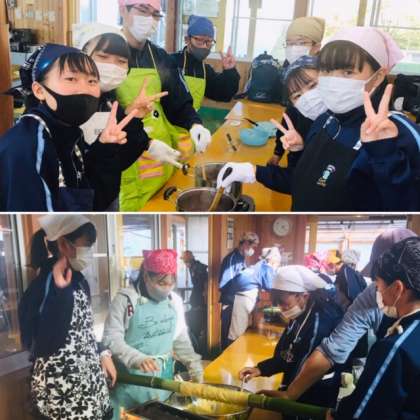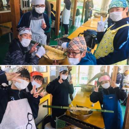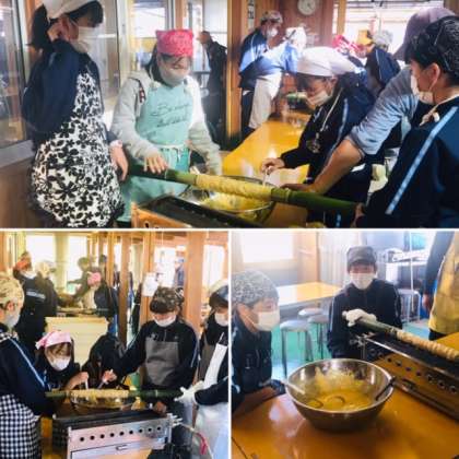 竹にホットケーキミックスを付け、最初はカリっと焦がしそこからは地道にホットケーキミックスをつけ、竹を回し続けます。