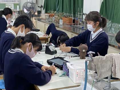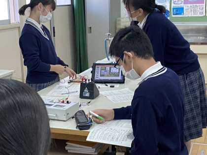 2年生の理科の授業では、タブレットを使って、電流計、電圧計の使い方を勉強しました。