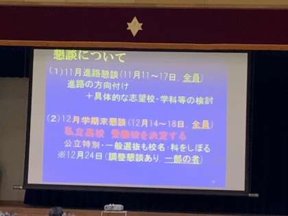 11日からは進路懇談も始まります。ご家庭で進路について、ゆっくりご相談いただければと思います。よろしくお願いいたします。
