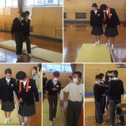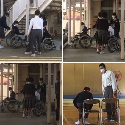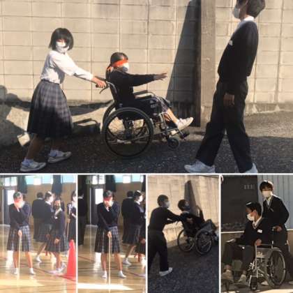 2年生、各クラスグループに分かれ、車いす体験学習や目が見えない状況での生活や不安、どのようなサポート(支援)が必要なのかを考えました。