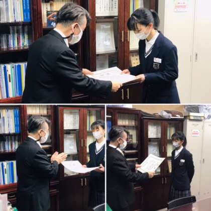 終業式は、コロナ対策を徹底した中(短時間、無言、換気)での開催となり、校長室で個別での表彰を行いました。